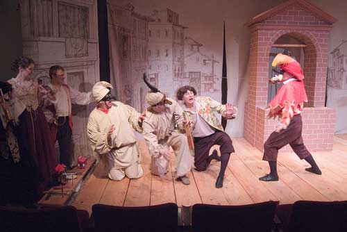 Lust, Lies and Marriage was a world premiere directed by the internationally acclaimed master of Italian comedy, Antonio Fava. In the play, Dottore tells his daughter she'll be marrying Lelio when all she wants to do is marry the handsome Orazio. A foreign woman named Celia falls in love with the same Orazio while another gentlemen named Odoardo falls in love with her. What's a servant or two to do but dress up in disguise and help love-struck masters figure the whole mess out! Add an enchanted well, a wily thief, a voluptuous inn-keeper and greedy fathers and you've got a classic set-up for an Italian farce Commedia dell'Arte style! The script, found in 1896 among 176 other scenarios in Casamarciano in the province of Naples, Italy, had been lost for over two centuries. It then languished in the Biblioteca Nazionale of Naples for another century. Italian scholars endeavored to study and transcribe the text. The English translation has only been available in the past few years. These scenarios represent the most important discovery in Commedia dellArte history. |